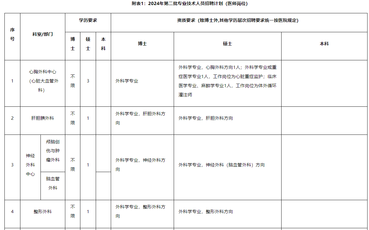 1.医师、医技、科研岗位:博士研究生按医院高层次人才管理办法中对应的人才层次确定年龄;硕士研究生及以下学历年龄不超过35周岁。具备下列条件之一者,年龄放宽到40周岁:(1)具有教师系列讲师及以上职称或研究系列助理研究员及以上职称;(2)主持省(部)级及以上教育教学研究项目或科研项目;(3)获得省(部)级及以上教学成果奖(排名第一);(4)发表中科院大类分区一区论著(第一作者或通讯作者)