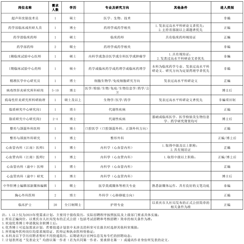 1.本公告仅为2024年度进人计划,主要用于接收简历,实际招聘程序按照医院及上级部门要求具体实施;